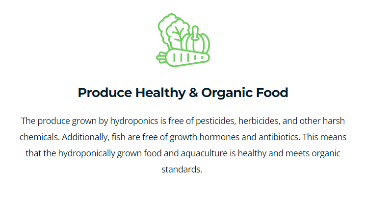 Hydroponic systems do not use any pesticides, herbicides, or hormones to produce food. This makes hydroponic food a healthier alternative to food produced through traditional agriculture. Hydroponic and aquaculture systems also give you total control over the nutrients that are used in the growing process.